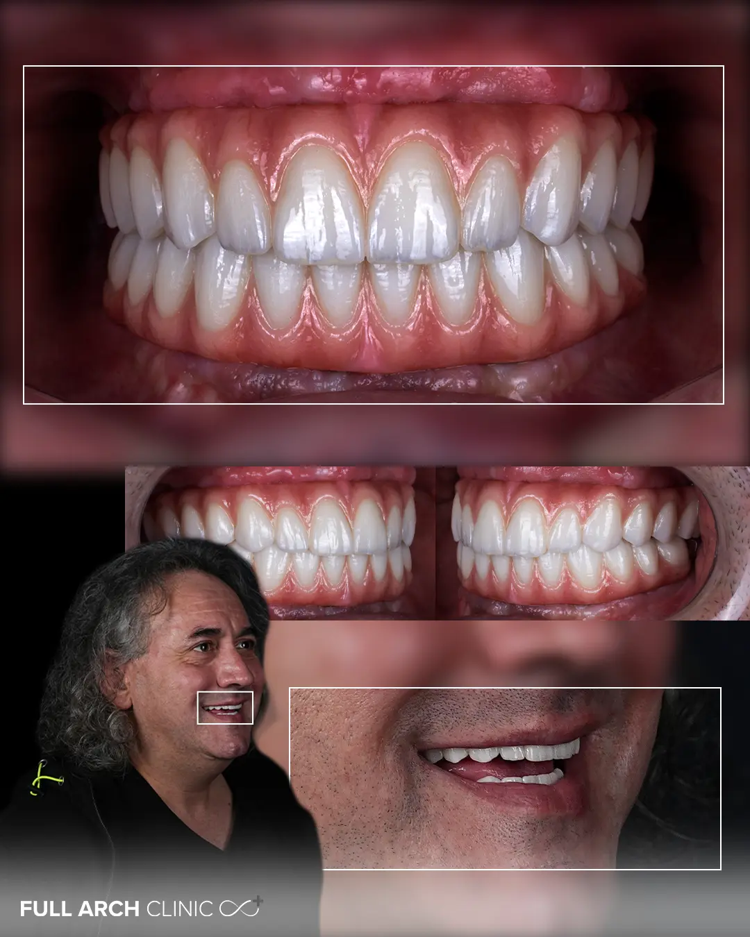 Dantură fixă definitivă din ceramică stratificată pe zirconiu pe ambele arcade — design personalizat pentru funcție optimă, estetică naturală și igienizare ușoară. Realizată integral în laboratorul intern Full Arch Clinic. Diferența față de provizorat: textură superioară, densitate perfectă, senzație naturală la nivelul limbii și obrajilor. Pacientul descrie senzația ca fiind identică cu dinții naturali.